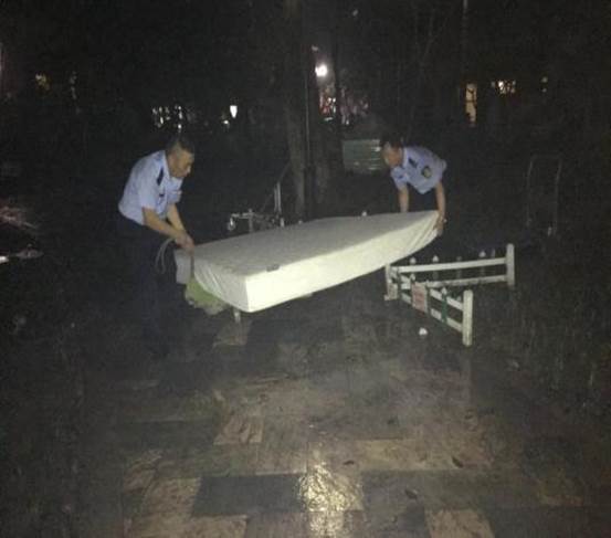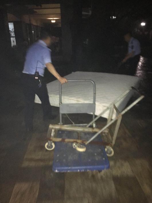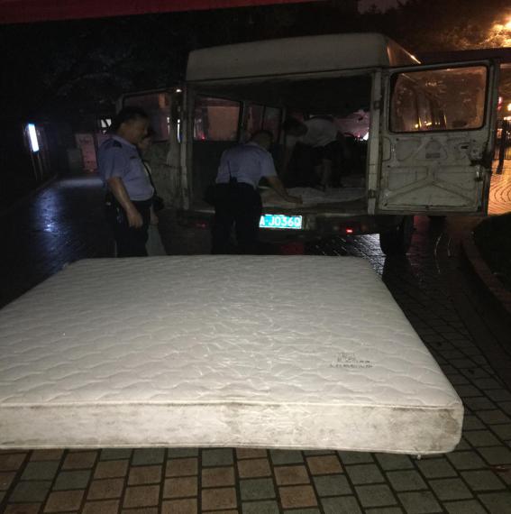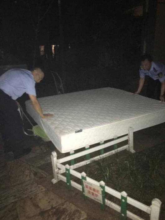 由于搬家过程中有一张1米8的床垫无法运送上楼,电梯楼梯间均不能容纳该床垫,迫于无奈,我只能将床垫放到楼栋大厅旁边的角落处。私人物件占用公共通道实属不应该,于是我赶紧联系了三方单位将此床垫运输至小区外。但该床垫是非常有厚度的棕垫,非常沉重,且天色已暗,雨水蒙蒙,我实在无力将床垫搬到车上去。在申请现场现场保安人员的帮助后,王明平、吴伟两位保安大哥二话不说,找来板车和垫子帮助我搬运床垫,最后终于顺利将床垫运送出去。