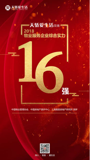 天骄爱生活荣膺物业服务企业综合实力TOP100测评第16强