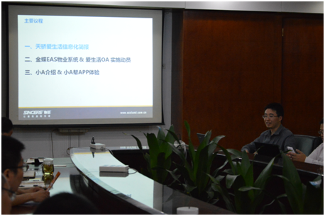 李总首先介绍了天骄爱生活信息化进程。信息化已为智慧社区的打造提供了无限可能,为更好地服务业主,天骄爱生活整合资源,充分策划,在原来的APP1.0版本上改造升级,推出了面向业主的APP“小A帮”2.0版,并将开发出面向管理者的“小A助手”。李总还介绍了金蝶EAS物业系统,并邀请金蝶公司为与会者介绍了爱生活OA的筹建情况。随后,信息中心主管奚婕为大家带来了“小A帮”APP实体操作,介绍可用的功能以及下一版本的优化和新增功能,这一环节也引起了大家的浓厚兴趣,纷纷掏出手机实时下载安装APP,试用其新功能。