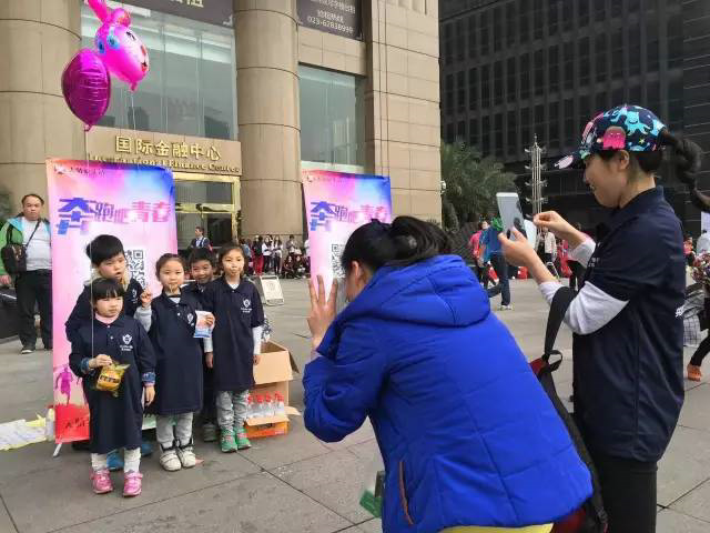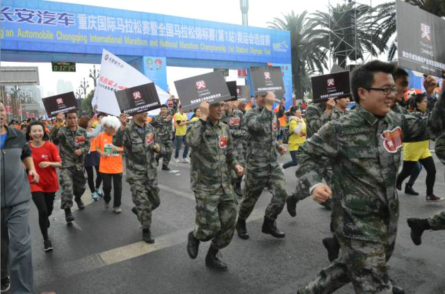 在起跑点上,有这样一群身背二维码的天骄人在忙碌着,他们将一瓶瓶饮用水递到跑友手上,现场扫描二维码并关注的跑友们还获得了一张拍立得照片,留下珍贵的回忆;随着起跑枪响,由20名身穿迷彩服的天骄督察队员与主管后备训练营的员工组成的天骄百人组跑团上场了,他们手举着为重马加油的标语,喊着整齐划一的口号,精神抖擞地随着大队伍前进,“重庆首家上市物业服务企业”的旗帜在现场迎风飘扬,显得尤为醒目,引得观众纷纷侧目并拍照。