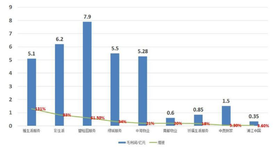 在毛利方面,碧桂园服务以7.9亿位列第一,相对于营收,碧桂园服务毛利排名上升说明成本控制不错。彩生活、绿城服务、中海物业、雅生活等毛利比较接近,分别为6.2亿、5.5亿、5.28亿、5.1亿。